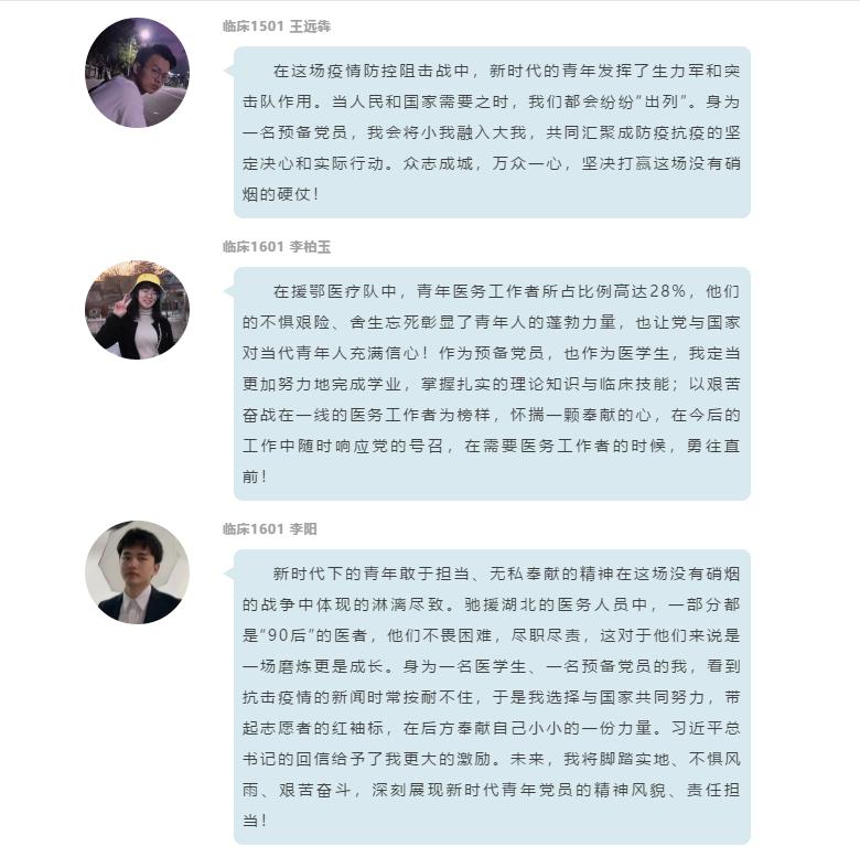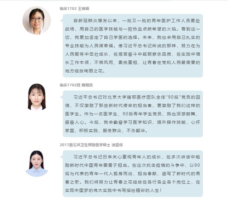 的众多学生党员中产生热烈反响。2017级公共卫生与预防医学专业硕士研究生党员、安徽省疾病预防控制中心疫情防控志愿者楚瑞林表示,全国上下同心协力是抗疫取得阶段性胜利的关键,广大医疗卫生工作者的全力以赴是打赢疫情阻击战的坚实力量。一线的“90后”“00后”青年,他们有热血、有担当、有本领、肯吃苦,彰显了新时代青年的蓬勃力量。习近平总书记的深情寄语和殷殷嘱托,必将激励着我们广大青年为打赢疫情防控阻击战奋力前行。我们将肩负起时代赋予的重任,在实现中华民族伟大复兴的中国梦的征程中不懈奋斗,书写青春里灿烂的人生华章。