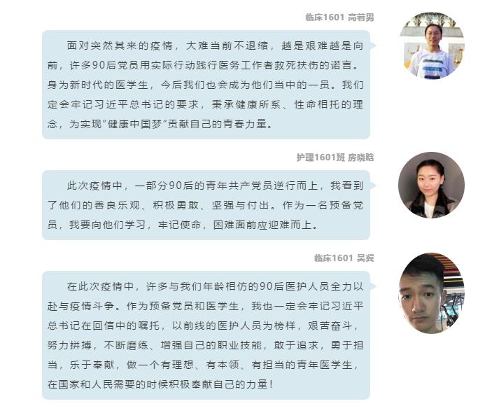 此外,医学院还有20多名学生党员提笔抒发自己心中的感慨。他们认为,身为“90后”的医学生党员,习近平总书记的回信给予了大家很大的鼓励,将激励大家继续坚守入党时的初衷和誓言,践行“健康所系,性命相托”的医学生誓言。未来,大家会努力提高专业水平,精进操作能力,将自己的所学用在人民需要的地方,用在国家需要的地方。作为“90后”的一代,会用实际行动来证明新时代青年人的家国情怀与责任担当。