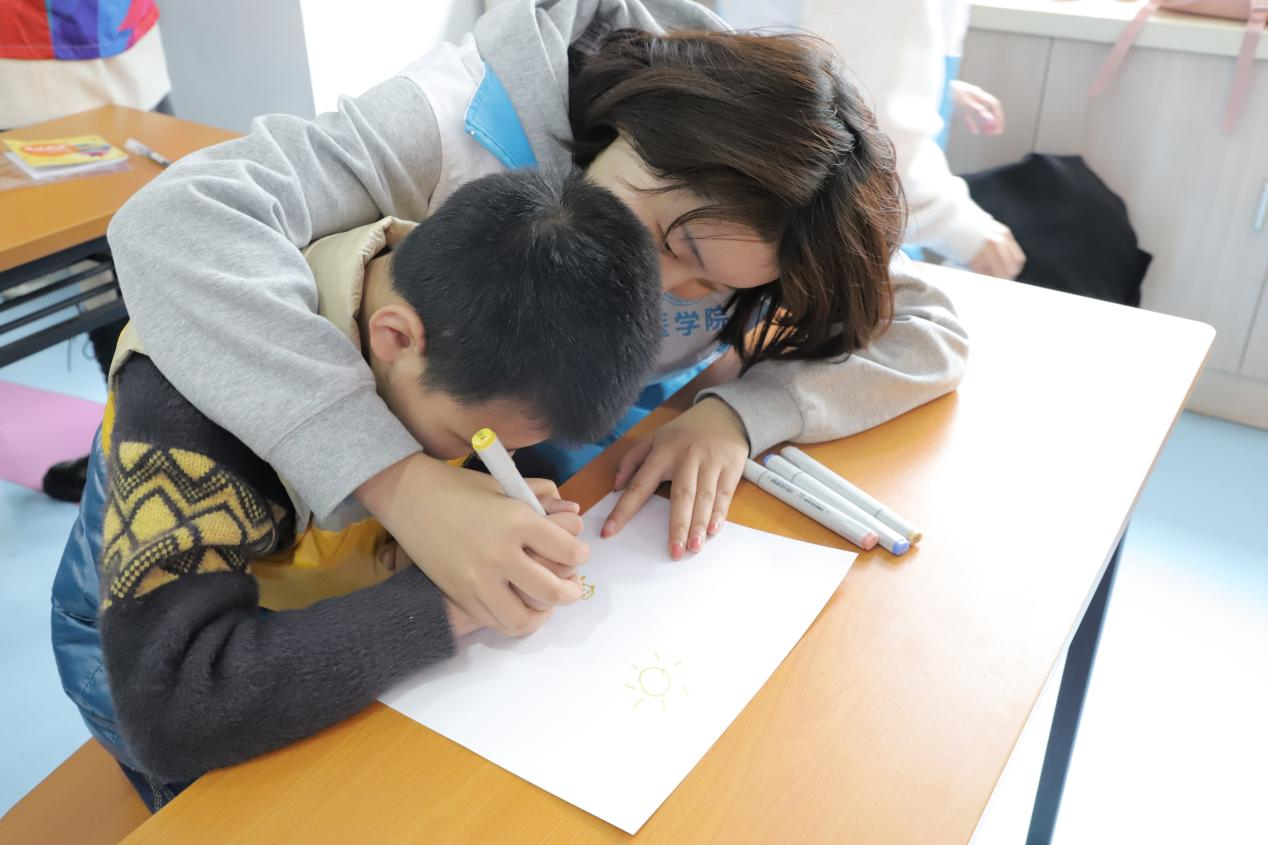 手工制作环节,志愿者们给孩子们分发了画笔和画纸,一起教孩子们画画、折纸。志愿者还和孩子们一起进行了抢凳子、萝卜蹲和传话游戏,在游戏中促进和自闭症孩子们的沟通和交流。