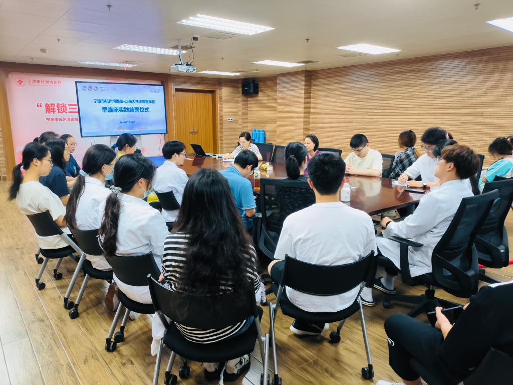 7月26日下午,此次早临床实践结营仪式在上海交通大学附属仁济医院宁波医院综合楼五楼会议室顺利闭幕,临床2303班李轩震和临床2302班别逸雯作为学生代表发言,致谢上海交大医学院附属仁济医院宁波医院提供的宝贵见习机会,细致梳理了临床实践内容,并结合个人成长经验畅谈心得感悟;与会各科室带教老师与同学们展开学习交流,真情流露师生共处的幸福点滴;党办副主任周佳宣布结营,并寄望优化早临床见习机制,持续深化育人内容,共同培养高水平区域医学人才。