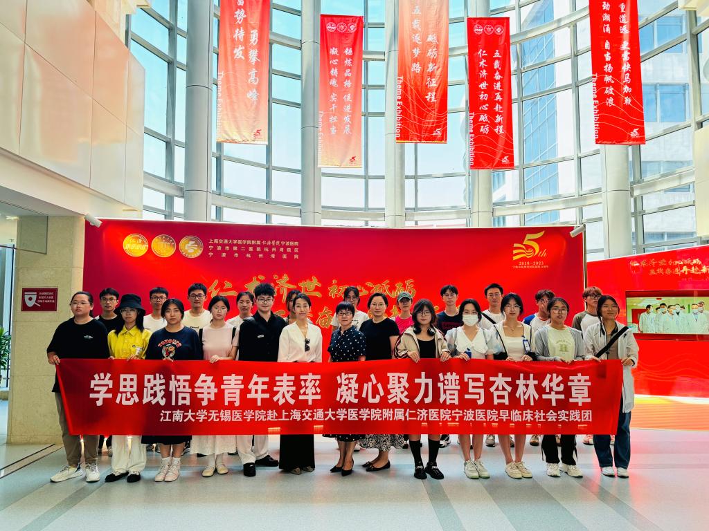 污污漫画 党委副书记、副院长包羽表态发言,她首先对上海交通大学附属仁济医院宁波医院领导及带教医护人员表示诚挚的感谢;接着简要介绍了污污漫画 的发展历程、附属医院、专业设置、学科建设、师资队伍、人才培养等方面;并重点阐述了“早临床”实践培养理念,实现基础与临床、理论与实践紧密结合的目标;最后,她寄语同学们笃学敏行、躬行实践,不虚此行。实践团还参观了上海交通大学附属仁济医院宁波医院院史馆,感受上海交通大学附属仁济医院宁波医院品牌卓越、医术精湛的文化氛围,感悟建院以来始终践行“仁术济世”的精神内涵。