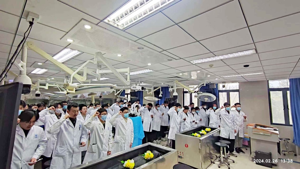 无言良师,授吾医理。伴随着全体医学生解剖学宣誓仪式的结束,《局部临床解剖学》课程正式开始。本次活动将思政课程与专业课程相融合,将医学人文教育与医学专业教育相贯通,充分发挥实践育人功能,为青年学子上了新学期第一堂意义非凡的“无声”思政课。