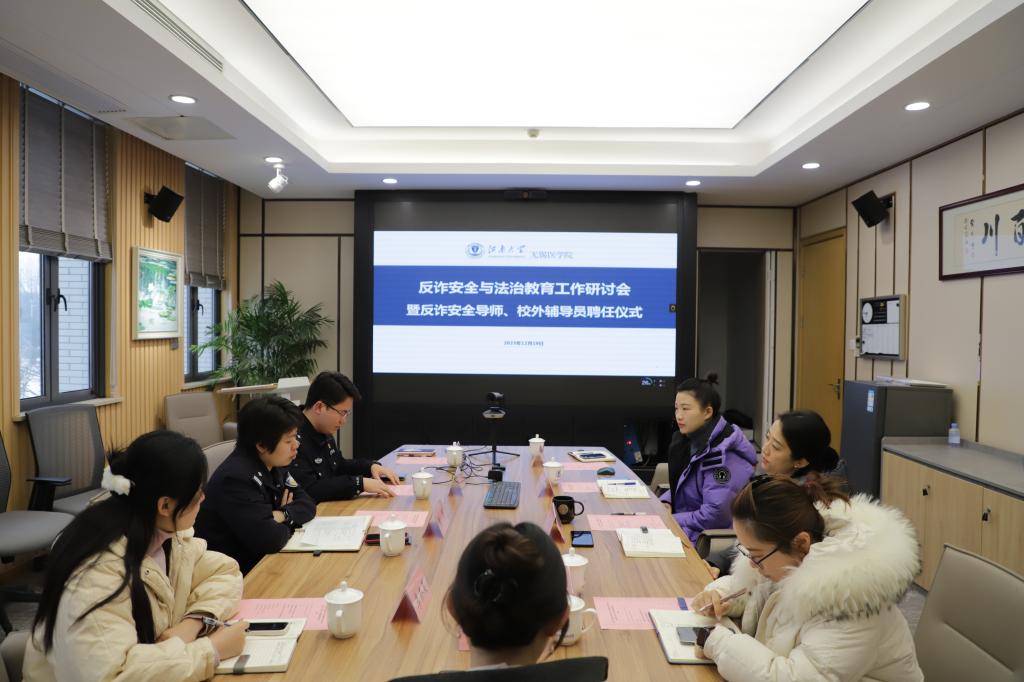 董蕾和杨恺结合高校易发的典型案例、常见形式、诈骗种类和特点,讲解了不法分子常见的电信诈骗手段和惯用伎俩,说明了防范诈骗及次生危害的必要性和重要性。董蕾请全体辅导员面向学生建立宣传到位便捷高效的诈骗信息反馈渠道,进一步织密校园反诈网。董蕾与杨恺同全体辅导员交流反诈及法制教育心得。