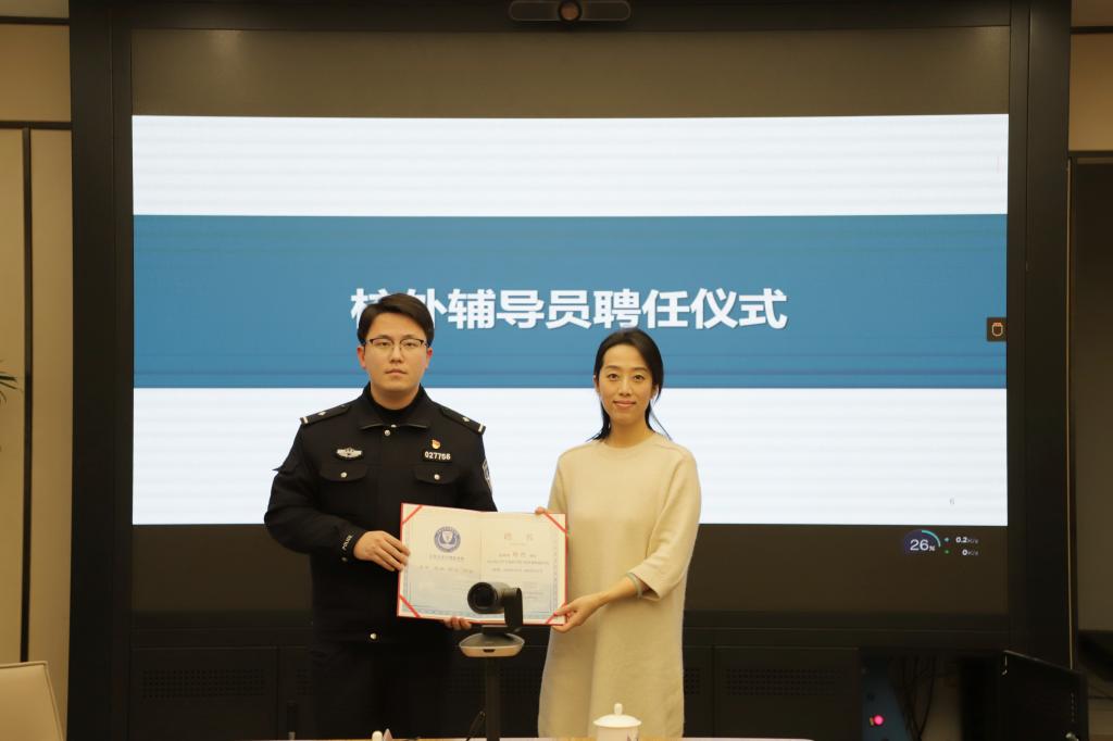 反诈安全导师聘书,为杨恺颁发校外兼职辅导员聘书,希望在雪浪派出所民警的支持和帮助下,学院能够不断完善反诈防骗与法制教育工作,持续提高学生的反诈积极性和强化学生自身的法制观念,共建平安和谐校园。