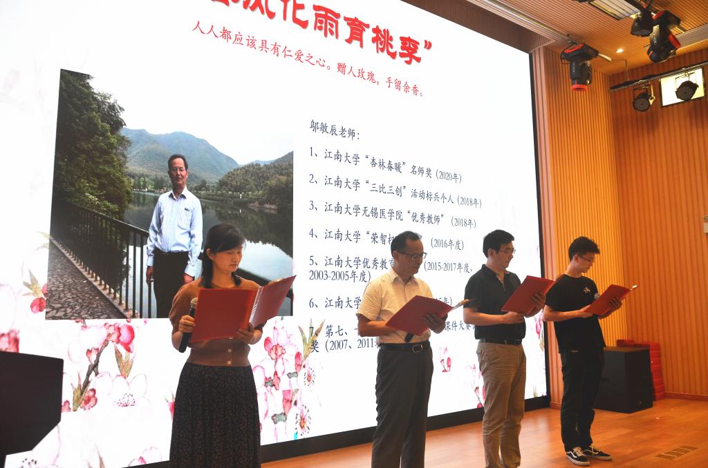 的教师。他们师徒四代,一代代接过教书接力棒。“教师”二字对于他们四人来说不仅仅是一份职业,更是一种教书育人精神的传承。在教师节庆祝大会上,师徒四代的邬敏辰、邓超、林丹、王少和老师表演诗朗诵《长大后我就成了你》,深情演绎博爱、仁心和传承的精神,将立德树人奋进担当的理念表达得淋漓尽致。