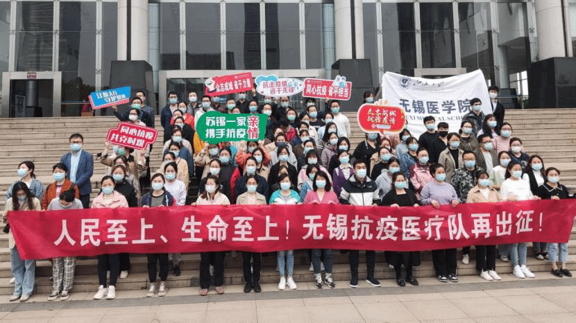 16点30分左右,医学院教师志愿服务队和无锡其它抗疫医疗队在无锡市人民大会堂集体出征,市卫健委党委副书记王新华等领导为所有队员送行,叮嘱队员们发扬伟大抗疫精神,充分借鉴以往援助救治经验,圆满完成任务,同时加强安全防护,平安归来。