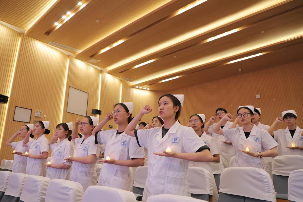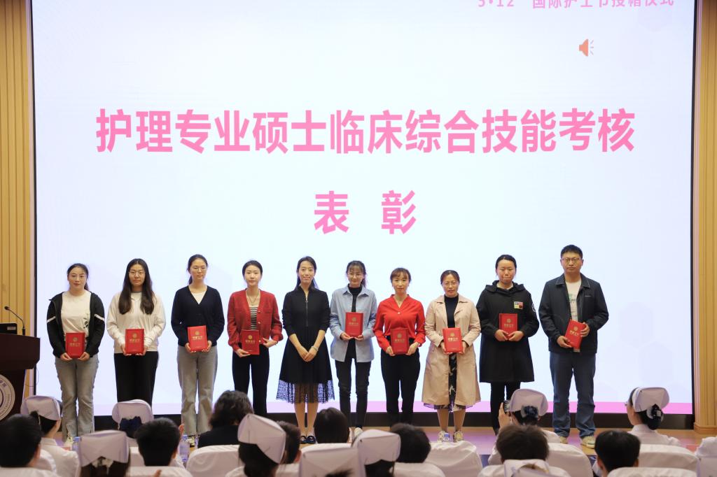 护理系教师柳丰萍的领誓下进行庄严宣誓。包羽为护理专业硕士临床综合技能考核获奖同学颁发表彰证书。护理专业学生李卓然作为学生代表发言并为各附属医院及医学院全体护理系师生送上节日的祝福。