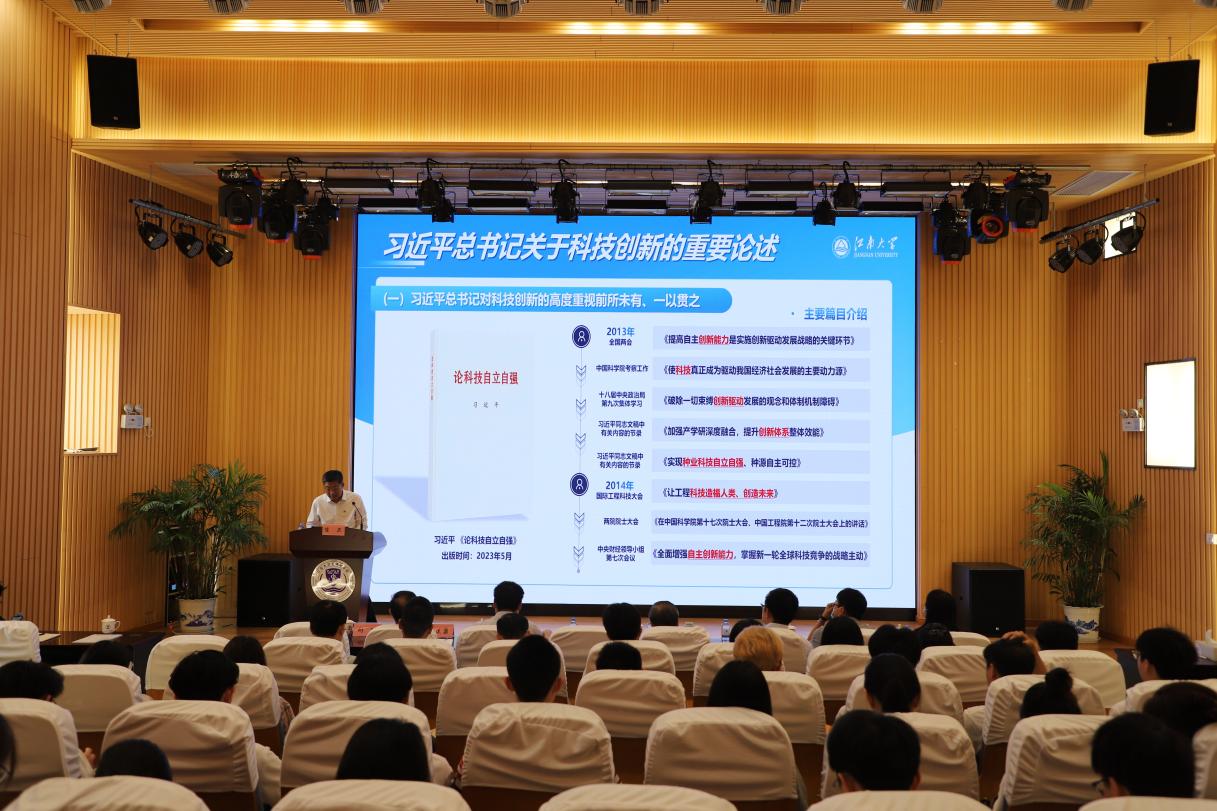党课现场,陈卫向在场青年教师、学生党员讲授以“担当科技自立自强使命 推进建设科技强国步伐”为题的主题教育党课。陈卫从习近平总书记《论科技自立自强》一书入手,从马克思主义中国化的“理论逻辑”、国家兴衰的“历史逻辑”、社会发展的“现实逻辑”,我国外部环境的“倒逼逻辑”以及科技自身发展的“演进逻辑”带领师生理解领会习近平总书记关于科技创新重要论述的深刻内涵,他强调习近平总书记关于科技创新的重要论述系统完备、逻辑缜密,是新时代科技工作的行动指南和根本遵循。随后,陈卫带领师生们系统回顾了建党前后、革命战争时期以及建国至今三个时期科技创新事业的发展历程,并从“四个面向”的角度为师生讲解了新时代科技强国建设的伟大成就和宝贵经验。最后,陈卫勉励广大师生要胸怀国之大者、提升科研能力、追求科学真理,为我国科技自立自强和科技强国的建设而不懈奋斗。