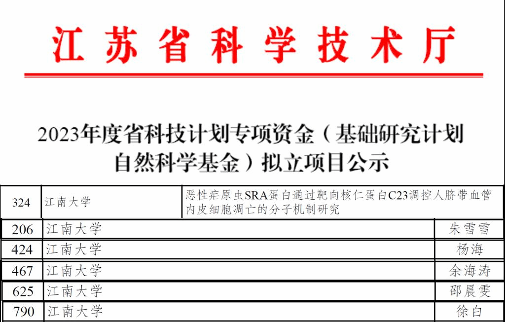 1项省面上和5项省青年拟获立项资助,其中程洋教授申请的省面上项目获得立项,题目为“恶性疟原虫SRA蛋白通过靶向核仁蛋白C23调控人脐带血管内皮细胞凋亡的分子机制研究”,余海涛、邵晨雯、朱雪雪、徐白和杨海老师申请的省青年项目获得立项,题目分别为“ATOX1缺陷通过铜死亡促进阿尔茨海默病认知损伤的具体作用机制研究”、“基于ABAD近红外荧光探针的癫痫脑内成像和小分子药物高通量筛选”、“脂肪因子nesfatin-1激活BMP-2信号通路在血管钙化中的作用及机制研究”、“脊髓背腹侧神经元前体细胞及运动神经元前体细胞移植促进脊髓损伤再生修复的研究”、 “金鸡纳啶通过抑制糖酵解途径改善治疗肥厚型心肌病的作用及其分子机制研究”。此次省自然科学基金申报项目获批立项是污污漫画