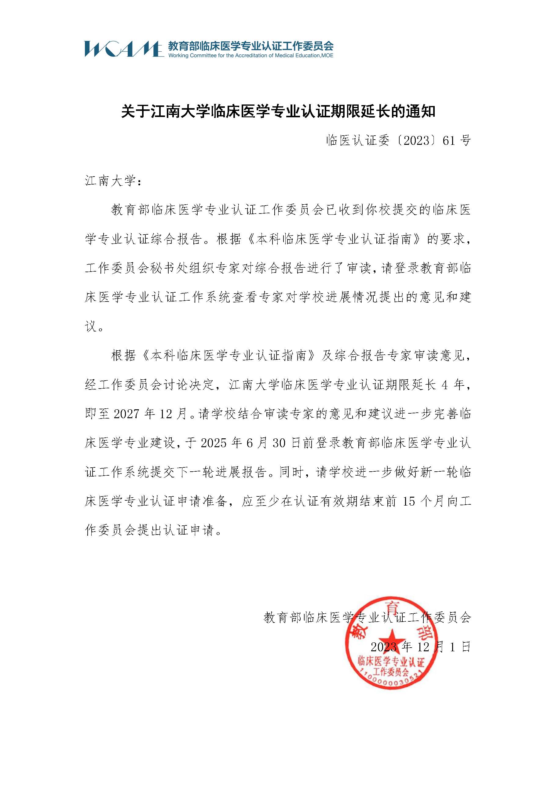 临床医学专业认证期限延长的通知