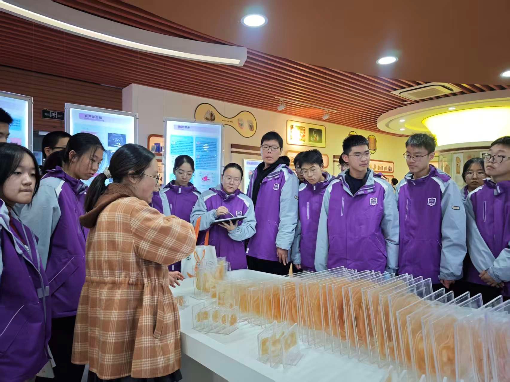 在系列课程首讲中,学生走出教室,走进充满科学奥秘的人体科学馆。一踏入馆内,排列整齐的人体标本与清晰标注的器官模型,瞬间将抽象的医学知识转化为可触摸、可观察的直观载体。在郭辉老师的细致引导下,学生们驻足于人体骨骼标本前辨识骨骼连接结构,围在解剖模型旁探究脏腑器官的位置关联,原本模糊的“人体结构”概念逐渐变得清晰具体。