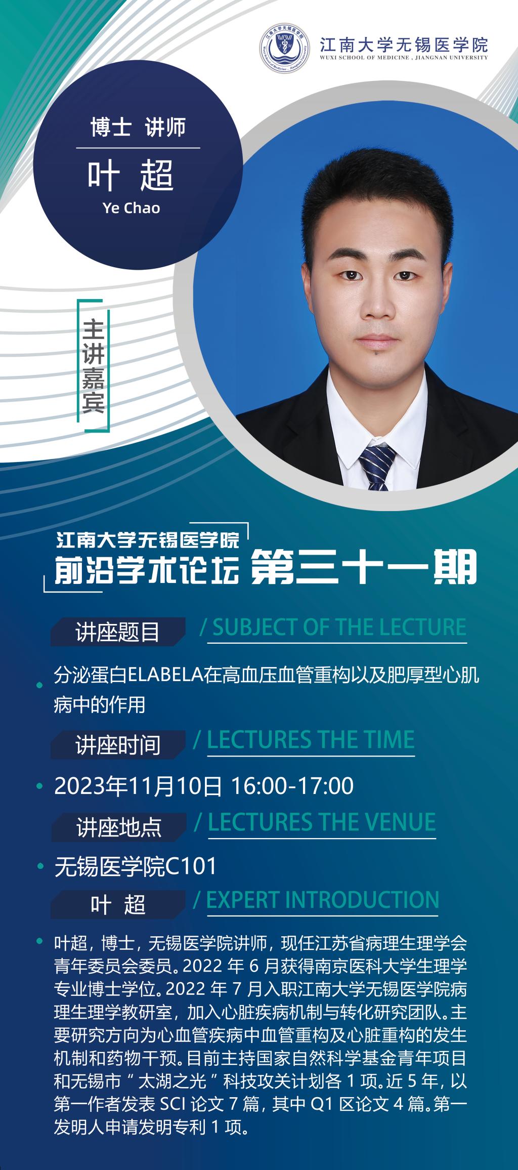 11月10日污污漫画 前沿学术论坛第三十一讲 叶超老师——分泌蛋白ELABELA在高血压血管重构以及肥厚型心肌病中的作用