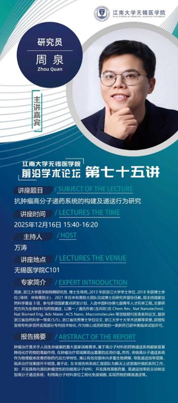 嘉宾简介:周泉,浙江大学医学院特聘研究员、博士生导师。2013年获浙江大学学士学位,2018年获博士学位(导师:申有青院士),2021年在申有青院士团队完成博士后研究并留校任教。现主持国家自然科学基金3项,参与多项国家重点研发计划,入选中国科协第七届青年人才托举工程。主要研究方向为生物材料与药物递送,以第一/通讯作者(含共同)在Chem Rev、Nat Nanotechnol、Nat Biomed Eng、Adv Mater、ACS Nano,Macromolecules等顶级期刊发表系列论文。