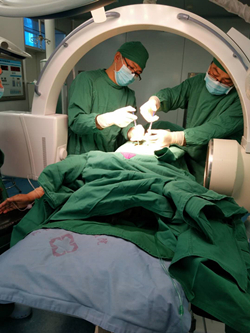 骨科杨小奇副主任医师(左一)带教当地医生开展首例经皮胸椎椎体成形术