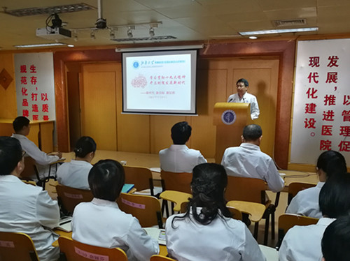 11月9日下午,附院华东院长在学术报告厅给全院党员干部和党员代表上了一堂题为“学习贯彻十九大精神开启附院发展新时代”的专题党课,用精彩生动的宣讲传递党的十九大声音,并结合附院2018—2020年三年规划作了发展蓝图的构想,让聆听者深受鼓舞和鞭策,达到了“学十九大精神 谋附院发展新征程”的良好效果。全体院领导、党员干部和党员代表共170余人参加。