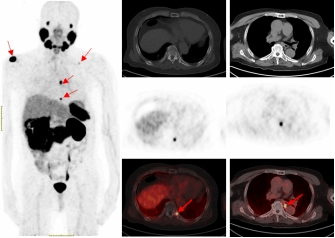附属医院要求进一步检查。经核医学科68Ga-PSMA PET/CT检查后结果显示,双侧肩胛骨、左侧第9后肋、第2腰椎及纵隔淋巴结均已存在癌症转移。