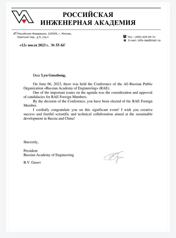 附属医院烧创伤诊疗中心主任吕国忠教授发来贺信,祝贺他当选为俄罗斯工程院外籍院士(FOREIGN FULL MEMBER, ACADEMICIAN)。