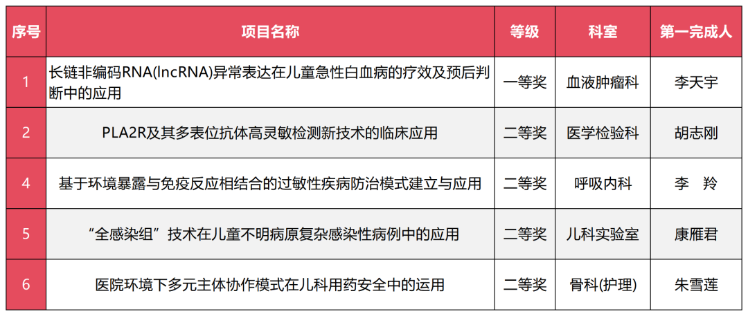 附属儿童医院)获得江苏省新技术引进奖5项,其中一等奖1项,二等奖4项。获奖总数在省内儿童医院中并列第二,一等奖获奖数在省内儿童医院中并列第一,实现新突破!
