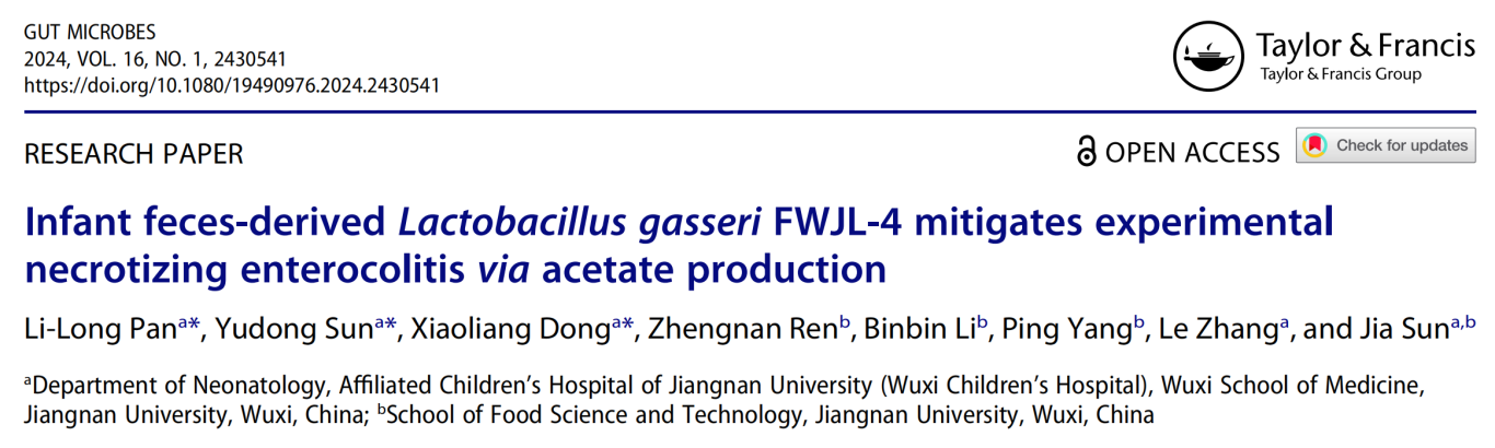 近日,无锡市儿童医院(污污漫画 附属儿童医院)以第一作者单位在肠胃疾病领域TOP期刊Cut microbes(中科院一区Top, IF=12.2)在线发表题为“Infant frces-derived Lactobacillus gasseri FWJL-4 mitigates experimental necrotizing enterociltis via acetate production的原创研究论文。
