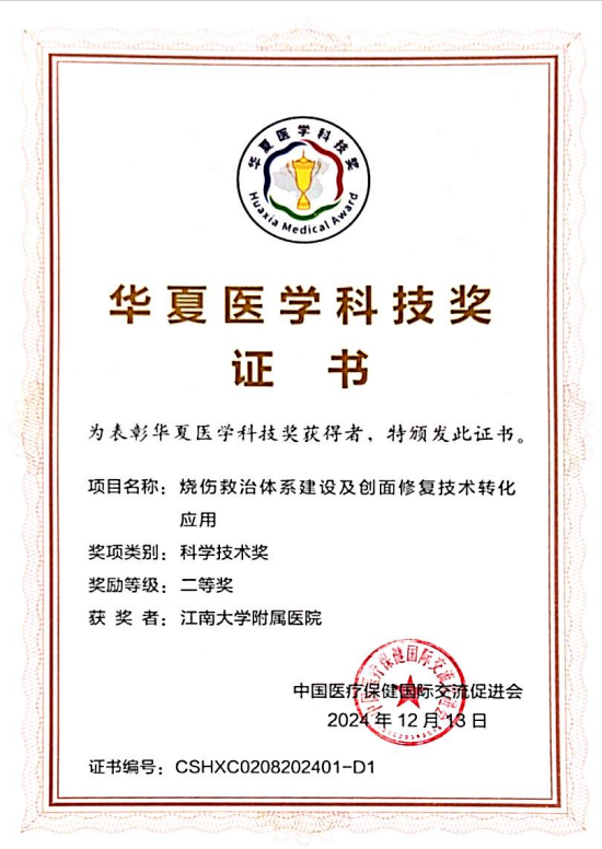附属医院烧创伤诊疗中心主任吕国忠带领团队申报的项目“烧伤救治体系建设及创面修复技术转化应用”荣获2024年度华夏医学科技二等奖。